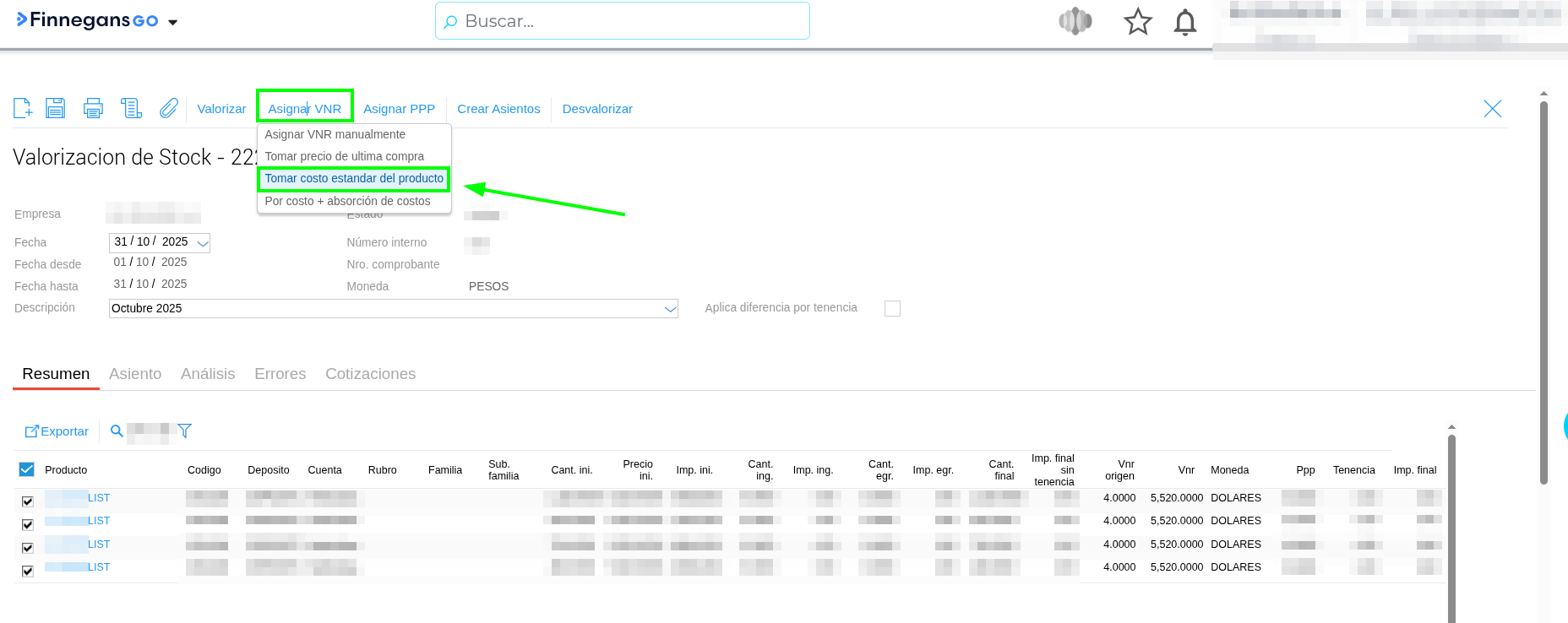 - Reasignar VNR: Vuelva a ingresar a la valorización y seleccione nuevamente la opción de Asignar VNR “Tomar costo estándar del producto”. Notará que ahora el sistema actualiza los importes basándose en la cotización que usted modificó en el paso 3.