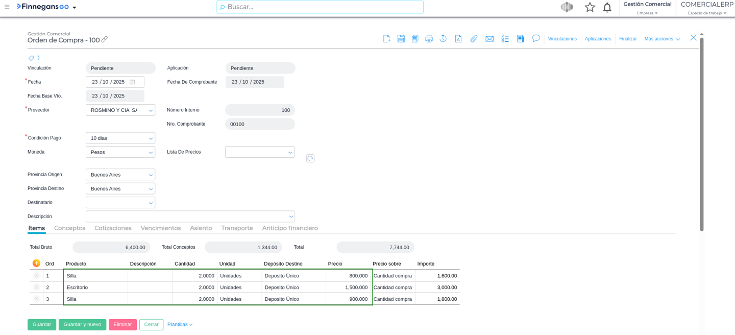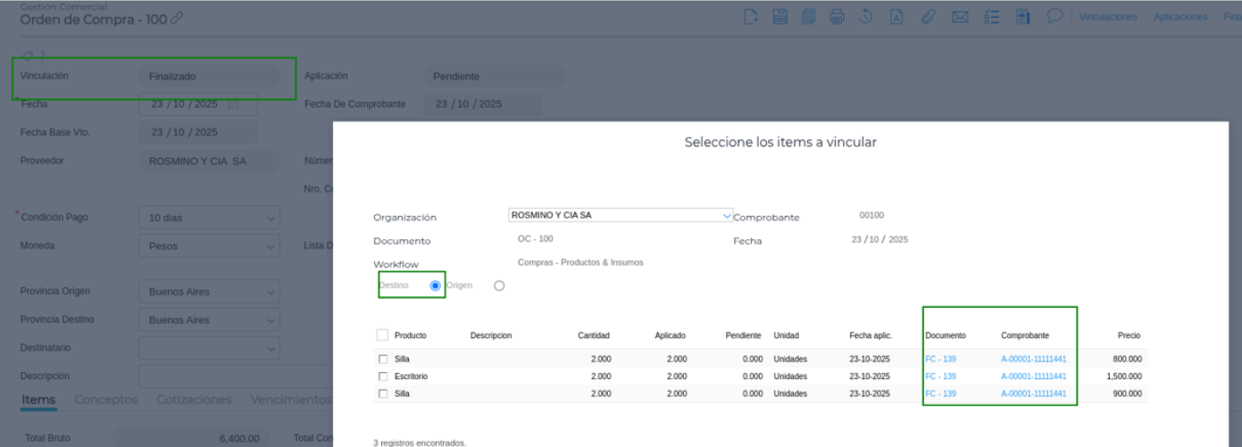 - Al verificar el detalle de “Vinculaciones” de la “Orden de Compra - 100”, se visualiza que la OC está finalizada: