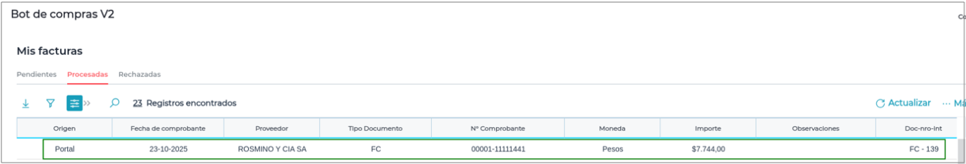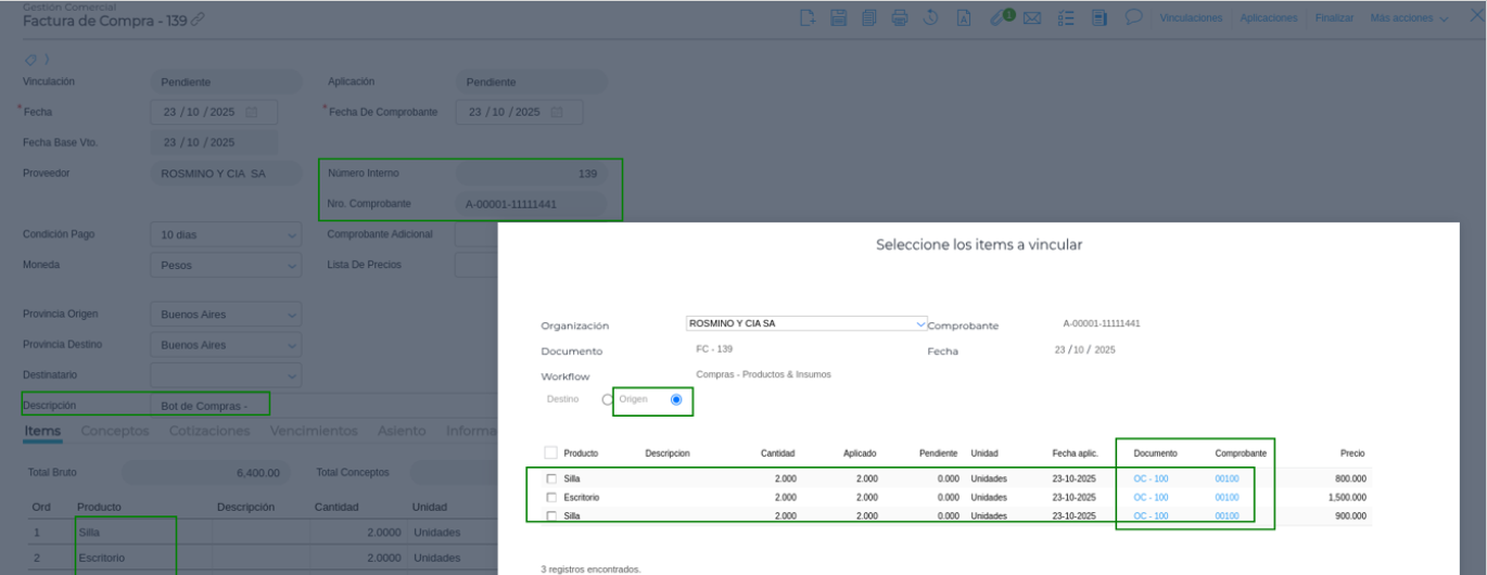 - Ir al ERP, acceder a Menú > Gestión Empresarial > Compras > Transacciones > Facturas. Al abrir el detalle de “Vinculaciones” de la Factura de Compra contabilizada desde el Bot de Compras, se visualiza que la vinculación con el documento de origen se hizo de forma correcta para todos los productos:
