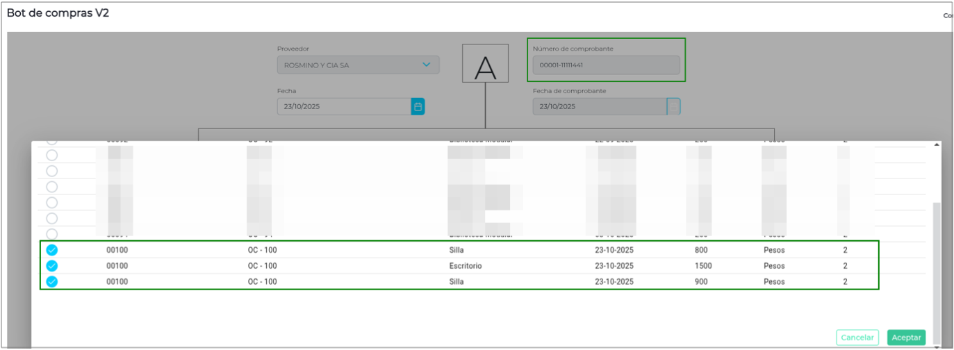- Ir al Bot de Compras y contabilizar una Factura de Compra que esté vinculada con un documento origen, en este caso la Orden de Compra - 100, la cual tiene productos repetidos: